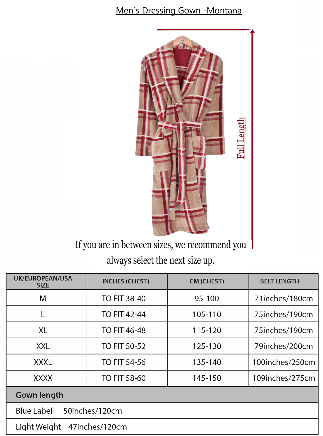 The Montana bathrobe features a soothing light brown hue adorned with large, rich red and white checkered lines.